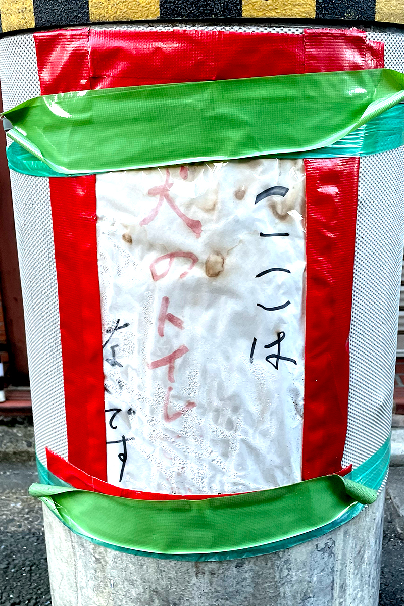 文法的に「ここは犬のトイレ『では』ないです」の方が正しいのではないかと思うが、それよりも多重テープでガッチガチに貼り付けてあるあたりに、「ここでクソさせんじゃねぇよ!」という強い意志を感じますね。
